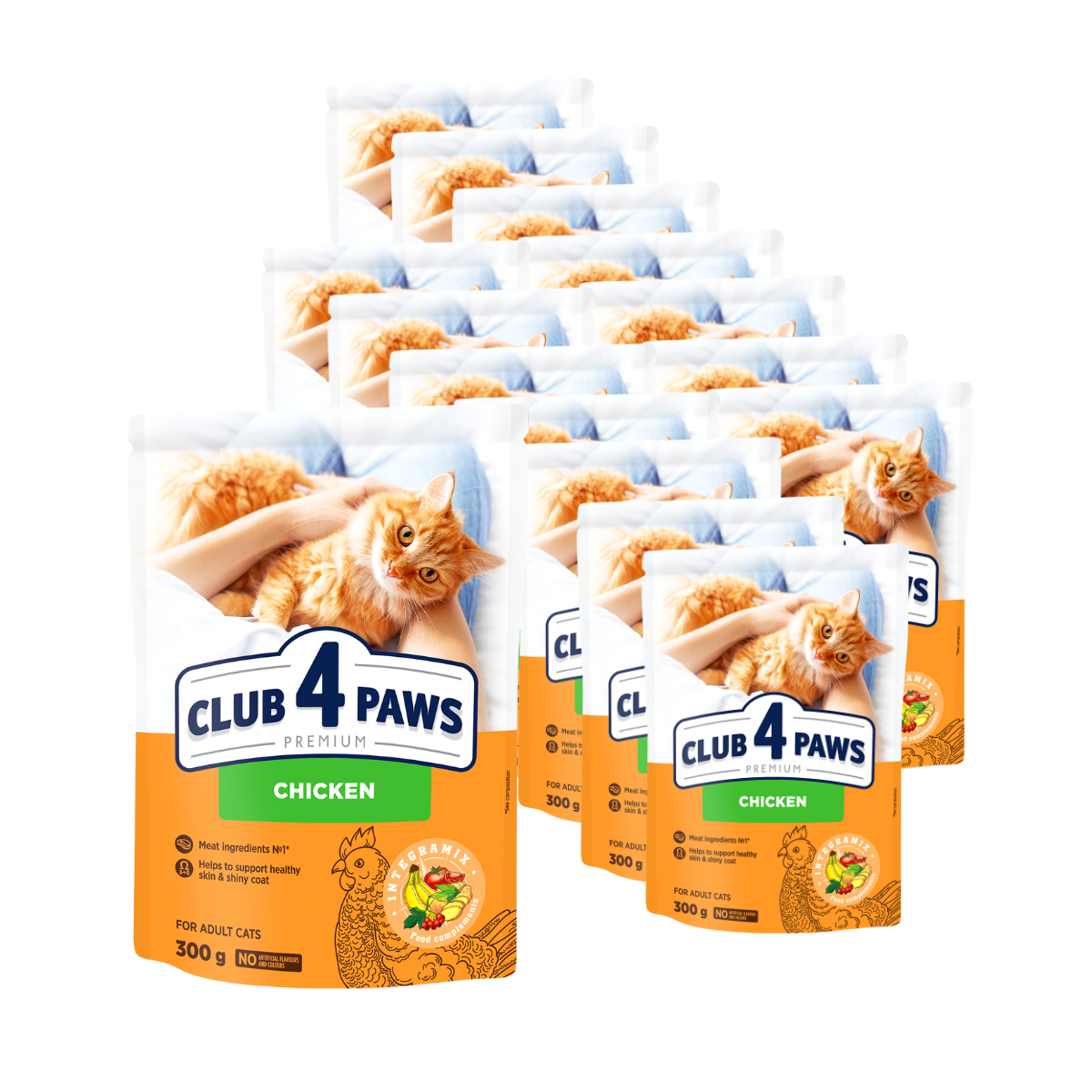 15 pungi a cate 300 g Club 4 Paws Premium cu pui – hrana uscata pentru pisici adulte.